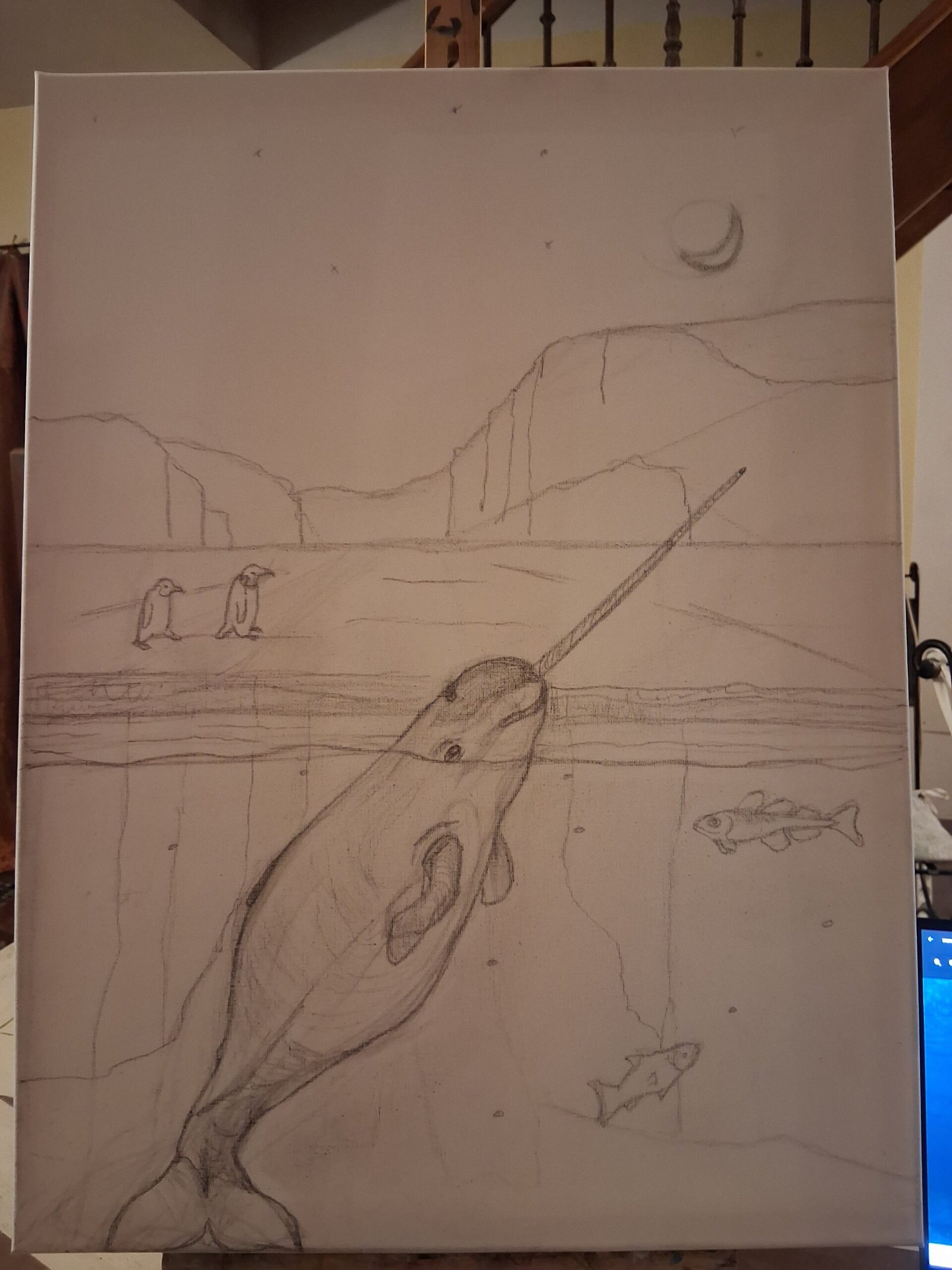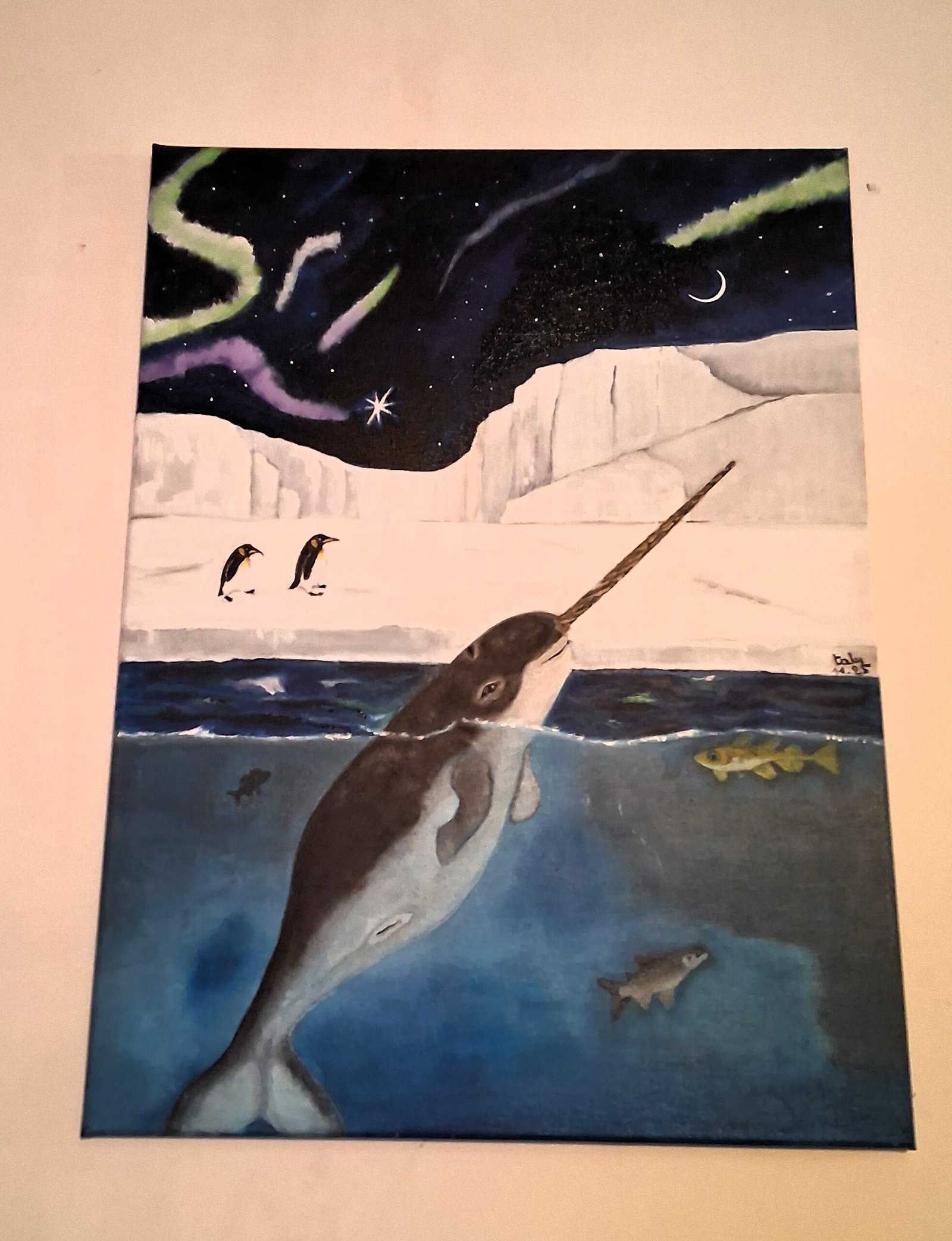 Dans cette lumière d’étoiles et de givre, une femelle narval perce la surface — apparition mythique, gardienne des secrets polaires. Sa défense torsadée capte les reflets du ciel, reliant les profondeurs de l’océan à l’infini du firmament.
