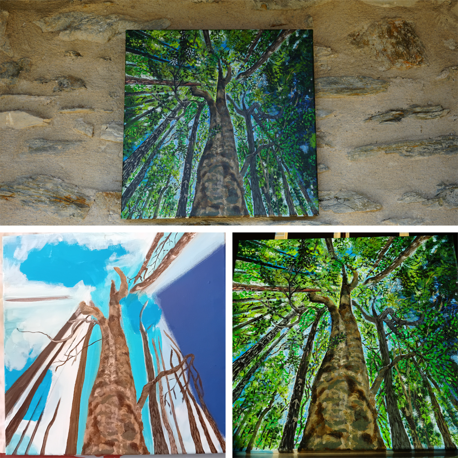 Peinture acrylique. Esquisse peinte : fond et troncs.