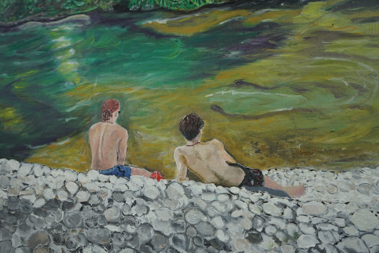 Sous la chaleur de l’été, des garçons sont assis sur les galets et regardent la rivière dans laquelle ils viennent de se baigner. Le plus jeune raconte comment il saute du haut du rocher avant d’y retourner.
