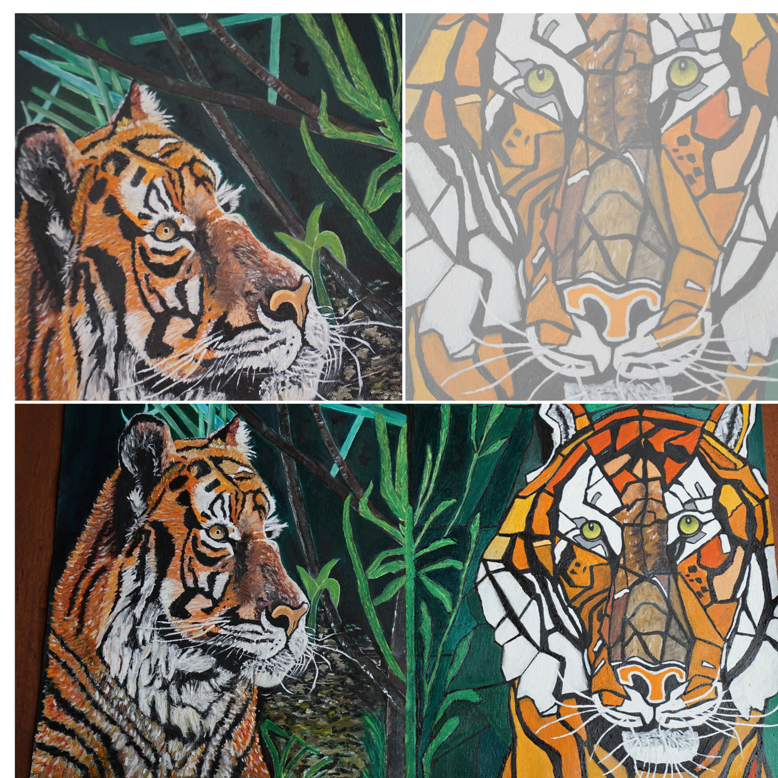 Deux tigres, un seul regard. L’un vibre d’instinct, de muscles, de silence animal. L’autre est pensée, de forme géométrique, abstraction figée. Ici, la jungle n’est pas seulement un décor, elle est témoin d’un dialogue. Entre ce que la nature façonne… et ce que l’humain tente de reconstruire.