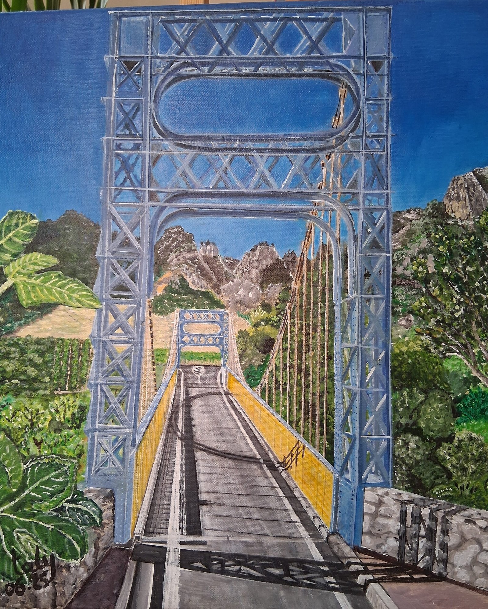 Suspendu au-dessus de la rivière, le pont bleu traverse un écrin de verdure. Derrière lui, le massif du Caroux et les gorges d’Héric dessinent un horizon sauvage et lumineux.