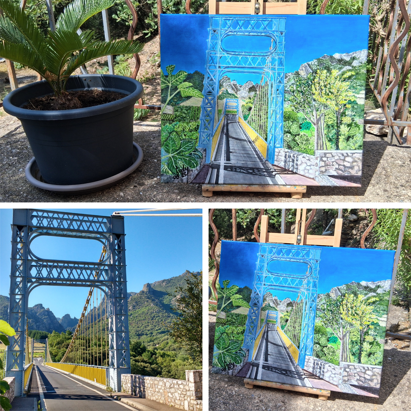 Suspendu au-dessus de la rivière, le pont bleu traverse un écrin de verdure. Derrière lui, le massif du Caroux et les gorges d’Héric dessinent un horizon sauvage et lumineux.